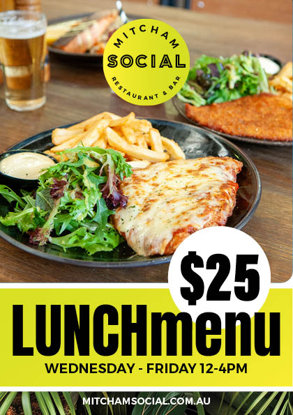 Enjoy our $25 Lunch Menu, available Wednesday to Friday from 12-4pm. Choose from delicious options like our Gluten-Free Parma & Fries, Wood-Fired Pepperoni Pizza, 200g Porterhouse Steak, Fish & Chips, and more!