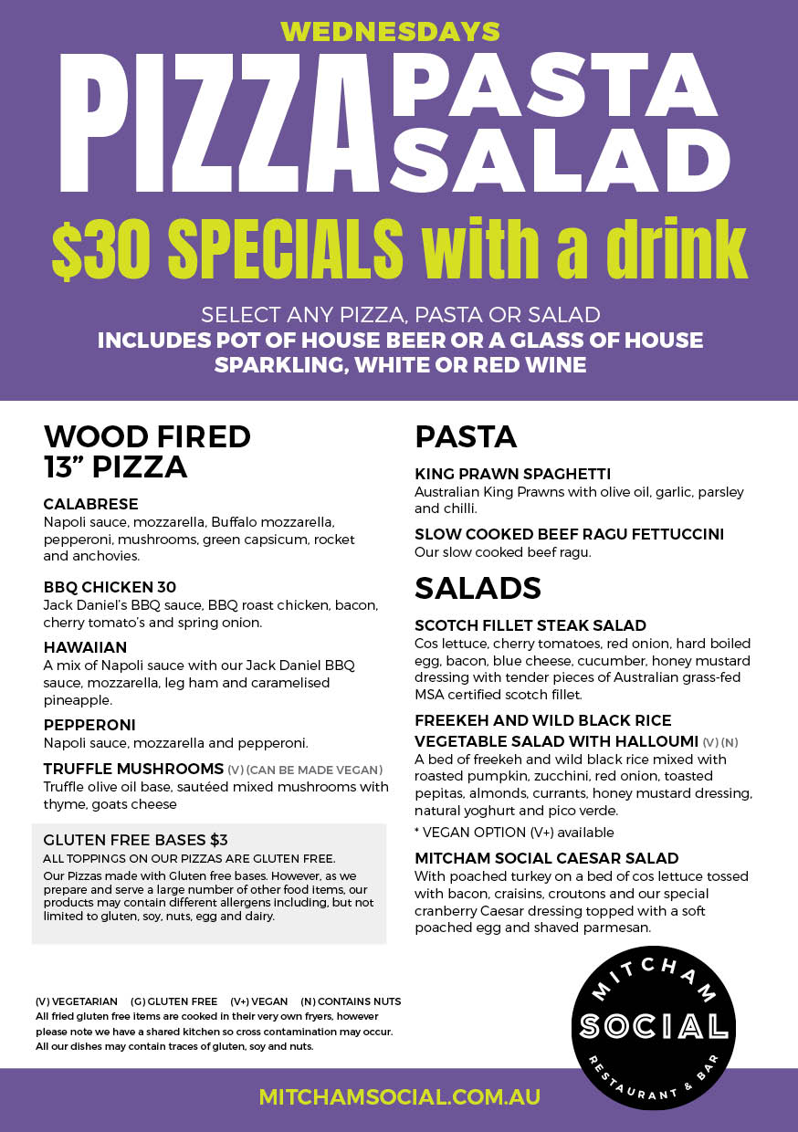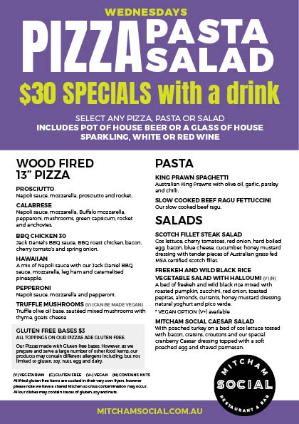 We’re back open Wednesdays and bringing back our $30 Pizza Pasta Salad specials which include a pot of house beer or glass of house wine.